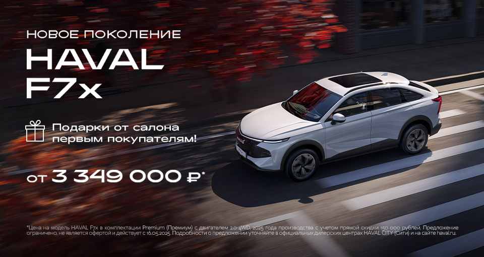 В сравнении с прежними поколениями HAVAL F7x. Цена на модель HAVAL F7х в комплектации Premium (Премиум) с двигателем 2.0 4WD, 2025 года производства с учетом прямой скидки 150 000 рублей. Предложение ограничено, не является офертой и действует с 16.05.2025. Подробности о предложении уточняйте в официальных дилерских центрах HAVAL CITY (Сити)
