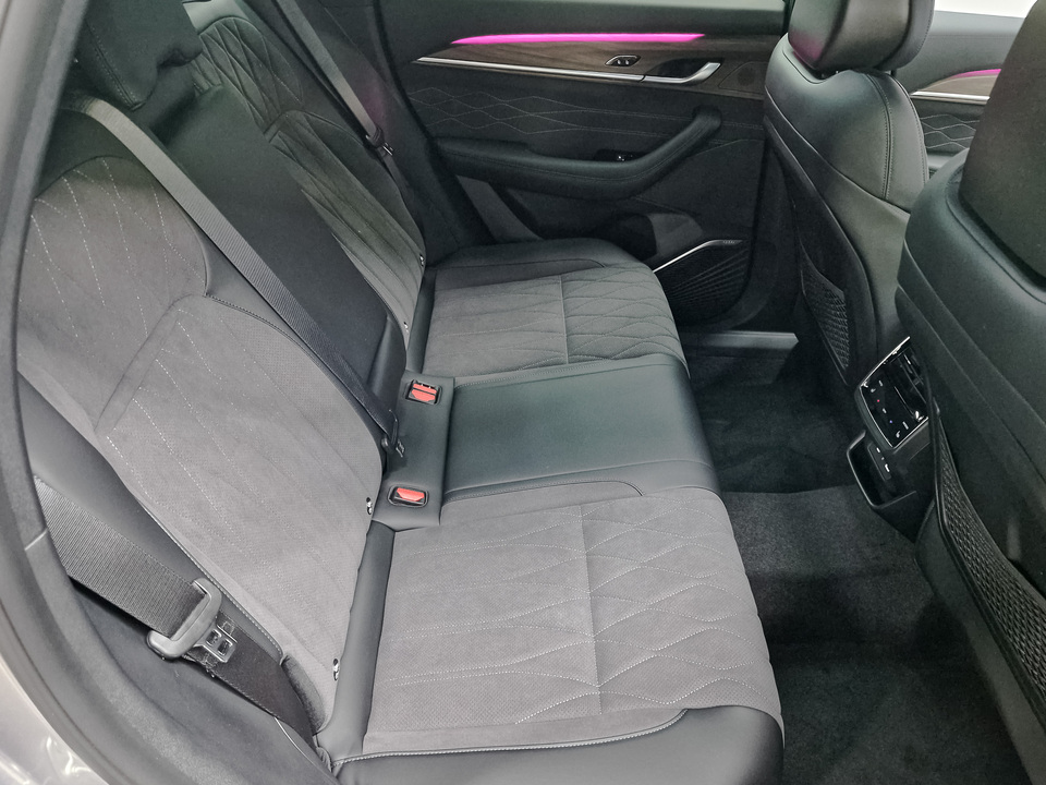Отделка интерьера и сидений чёрной кожей и замшей с ромбовидной прострочкой