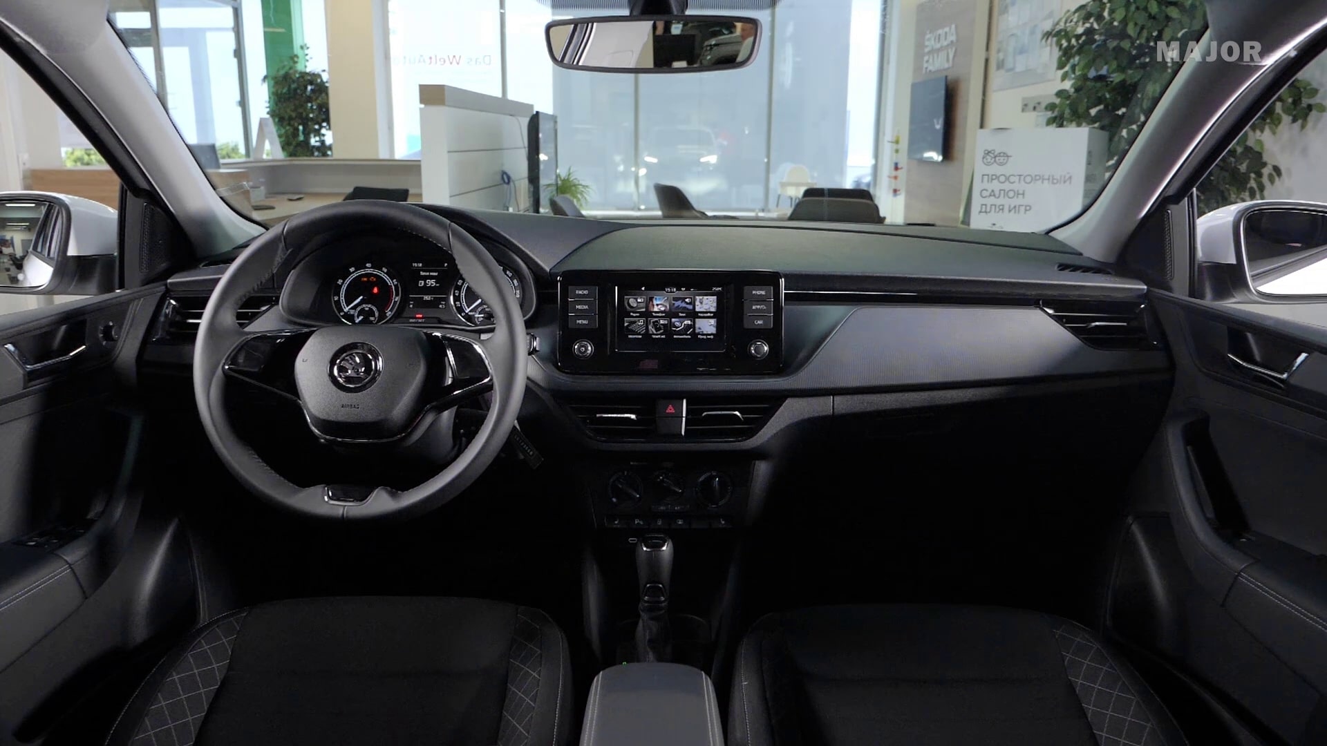 Внутренний дизайн Skoda Rapid продуманный, стильный современный и в нем нет отсылок к прошлому. Все элементы интерьера интегрированы, но при этом не напрягают глаз. Верхняя часть центральной панели из жесткого пластика; центральная часть всегда будет темного цвета, но несущественно будет меняться вид «накладки»; нижняя часть тоже из жесткого пластика. Дверная карта: вставки также из жесткого пластика и мягкие подлокотники. Перчаточный ящик достаточно вместительный.